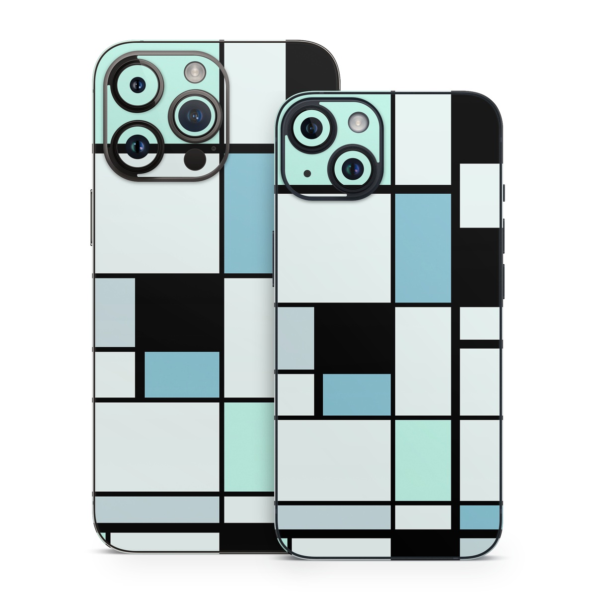 iStyles iPhone 14 Series Skin design of Blue, Line, Turquoise, Pattern, Rectangle, Design, Parallel, Square, Symmetry, Tints and shades, with black, blue, green colors, and tagged with patterns, blocks, blue, cool, geometry, lines.