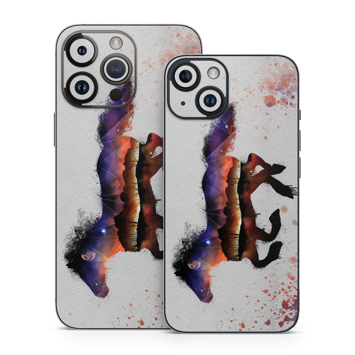 iStyles iPhone 14 Series Skin design of Watercolor paint, Illustration, Art, Horse, Paint, Drawing, Graphic design, Painting, Visual arts, Mustang horse, with gray, white, purple, red, yellow, black, orange colors, and tagged with animals, nature, space, animals, horse, moon, nature, night, stars, watercolor.