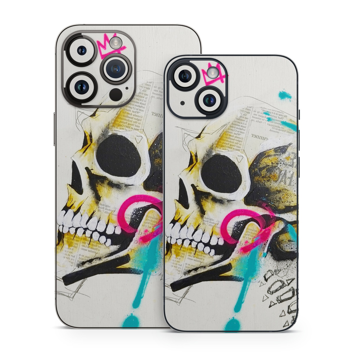 iStyles iPhone 14 Series Skin design of Graphic design, Skull, Illustration, Art, Bone, Drawing, Visual arts, Font, Modern art, Street art, with blue, pink, yellow, black colors, and tagged with skulls, abstract.