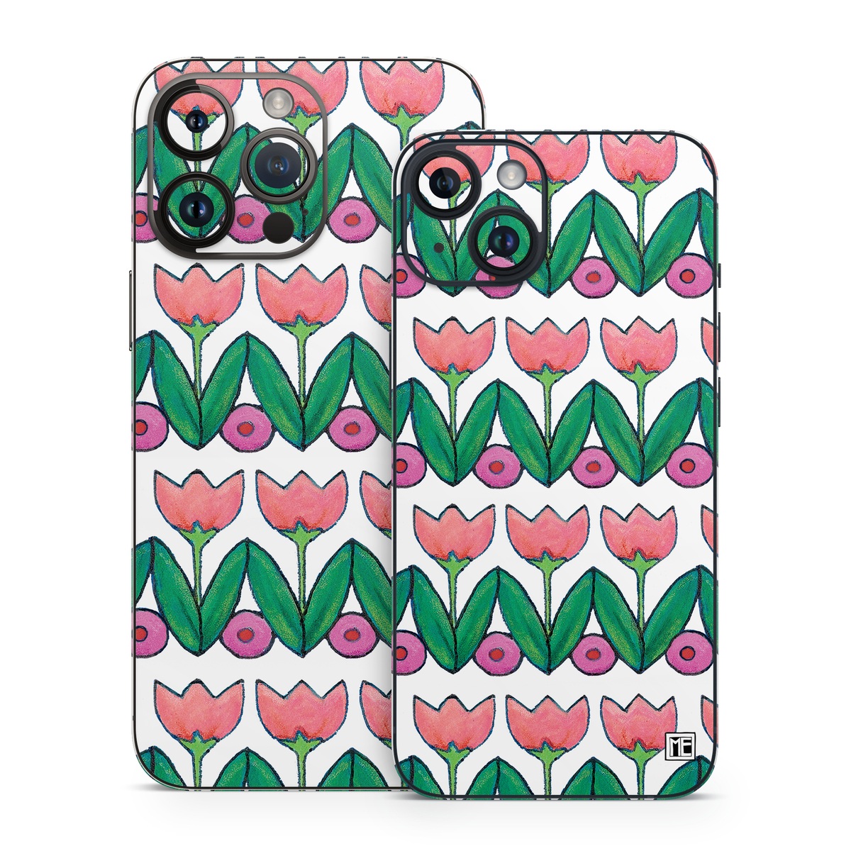 iStyles iPhone 14 Series Skin design of Green, Rectangle, Textile, Botany, Line, Symmetry, Art, Font, Pattern, Magenta, with white, green, pink, purple colors, and tagged with patterns, flowers, tulip, drawing, repetative.