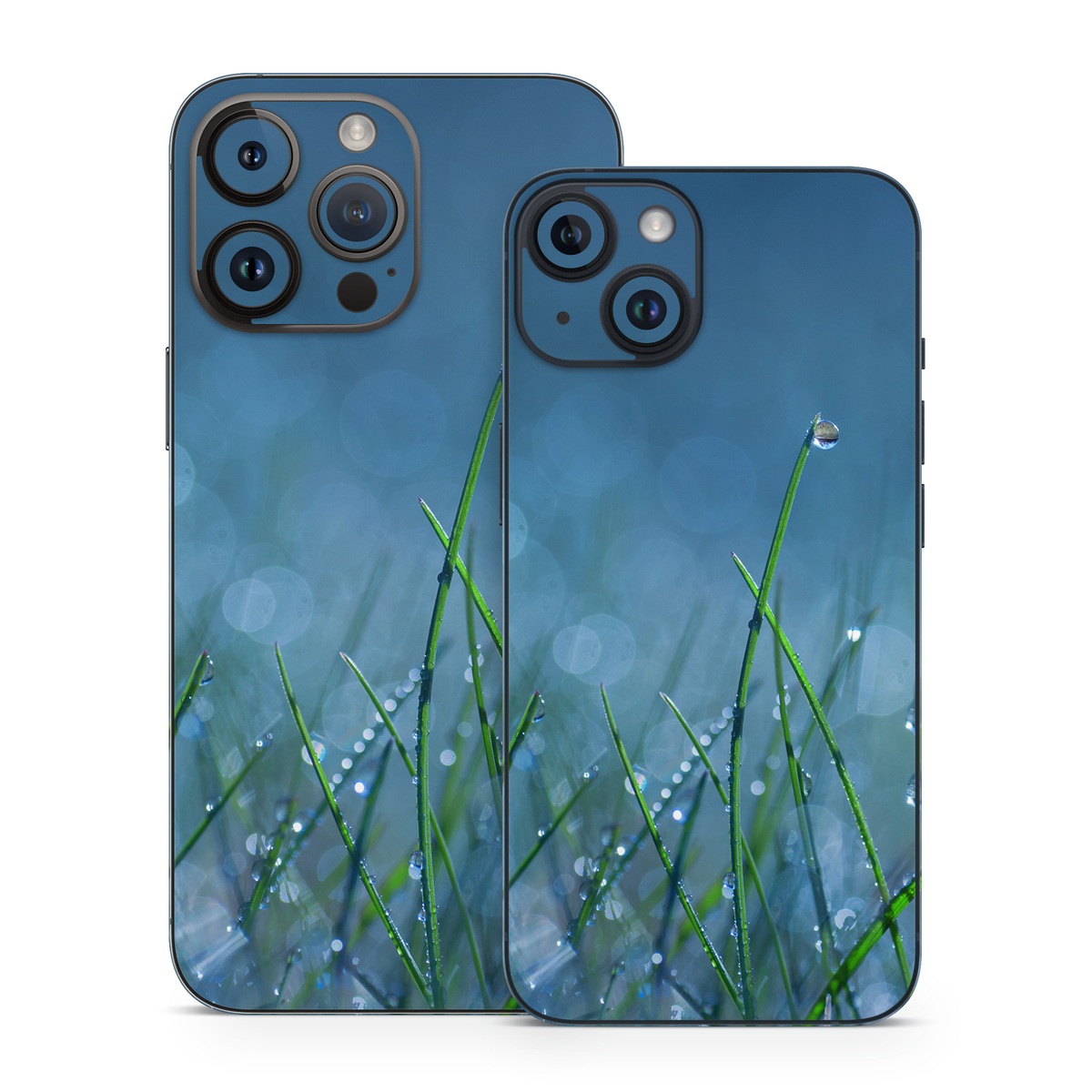 iStyles iPhone 14 Series Skin design of Moisture, Dew, Water, Green, Grass, Plant, Drop, Grass family, Macro photography, Close-up, with blue, black, green, gray colors, and tagged with nature, patterns.