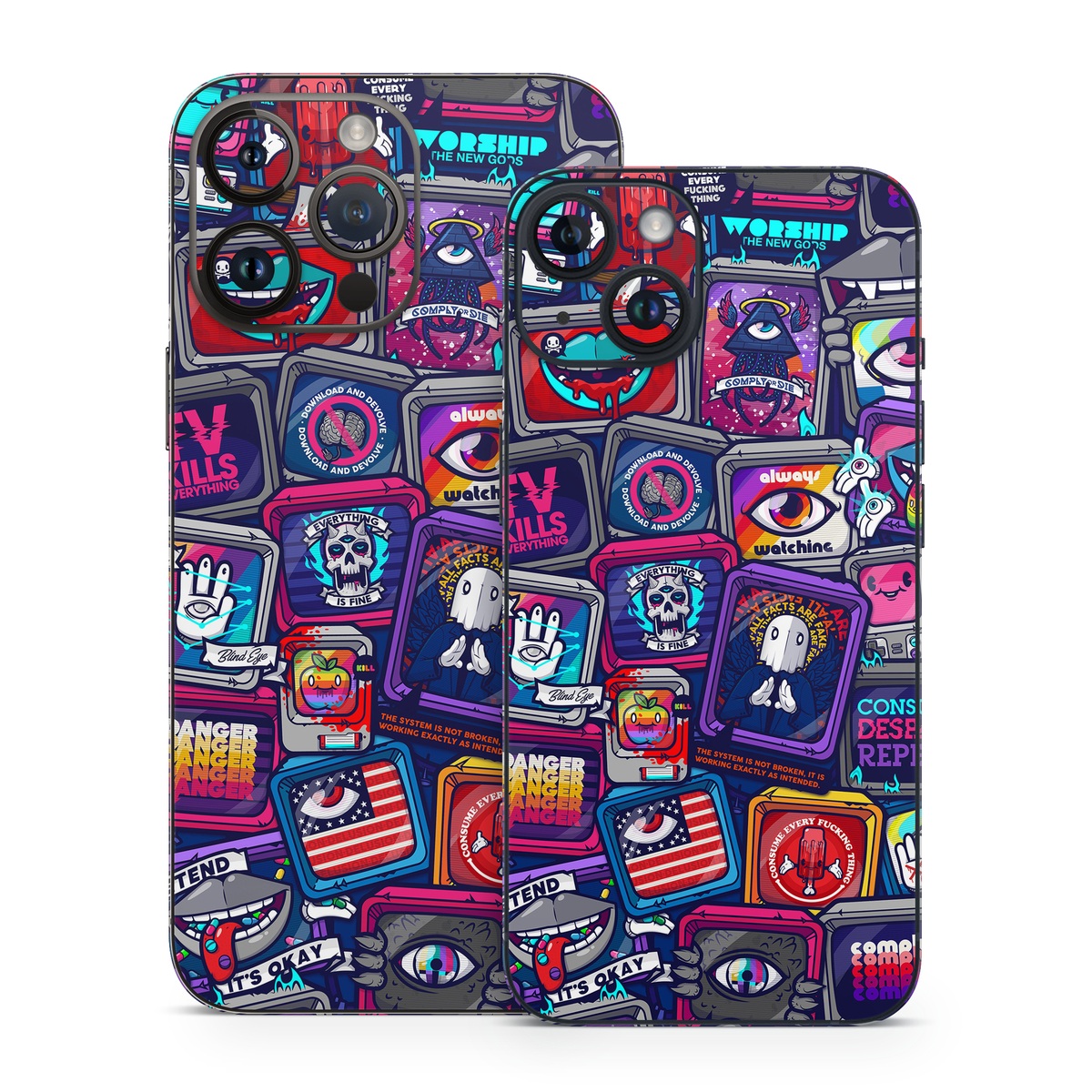 iStyles iPhone 14 Series Skin design of Pattern, Font, Art, Visual arts, Collection, with red, blue, black, gray, purple, yellow, white, green colors, and tagged with patterns, objects, signs, skulls, illustration, modern, skull, tattoo, thenewgods, tv, vector.