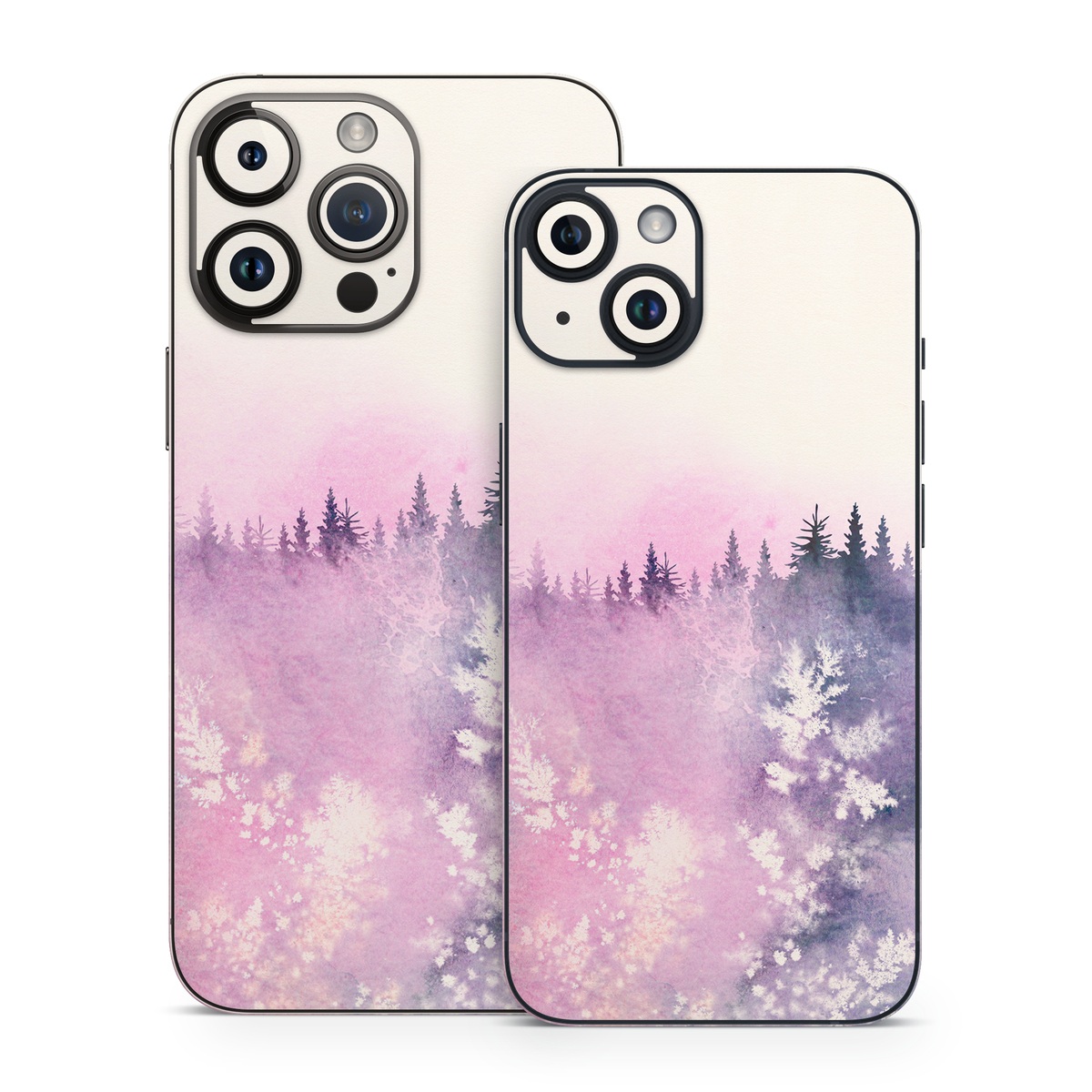 iStyles iPhone 14 Series Skin design of Watercolor paint, Sky, Atmospheric phenomenon, Tree, Atmosphere, Cloud, Landscape, Forest, Painting, Illustration, with white, yellow, pink, purple, blue, black colors, and tagged with nature, flowers, floral, nature, pine, plants, trees.