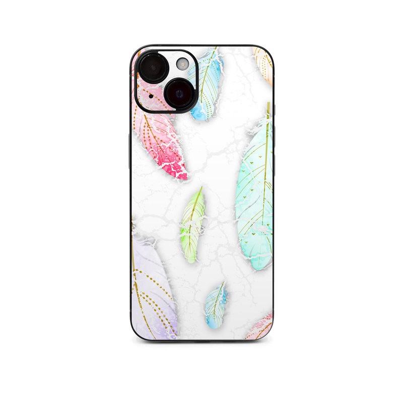 iStyles iPhone 14 Series Skin design of Feather, Fashion accessory, Jewellery, with red, blue, green, purple, white, brown colors, and tagged with patterns, objects, aztec, color, feather, feathers, marble, pastel, watercolor.