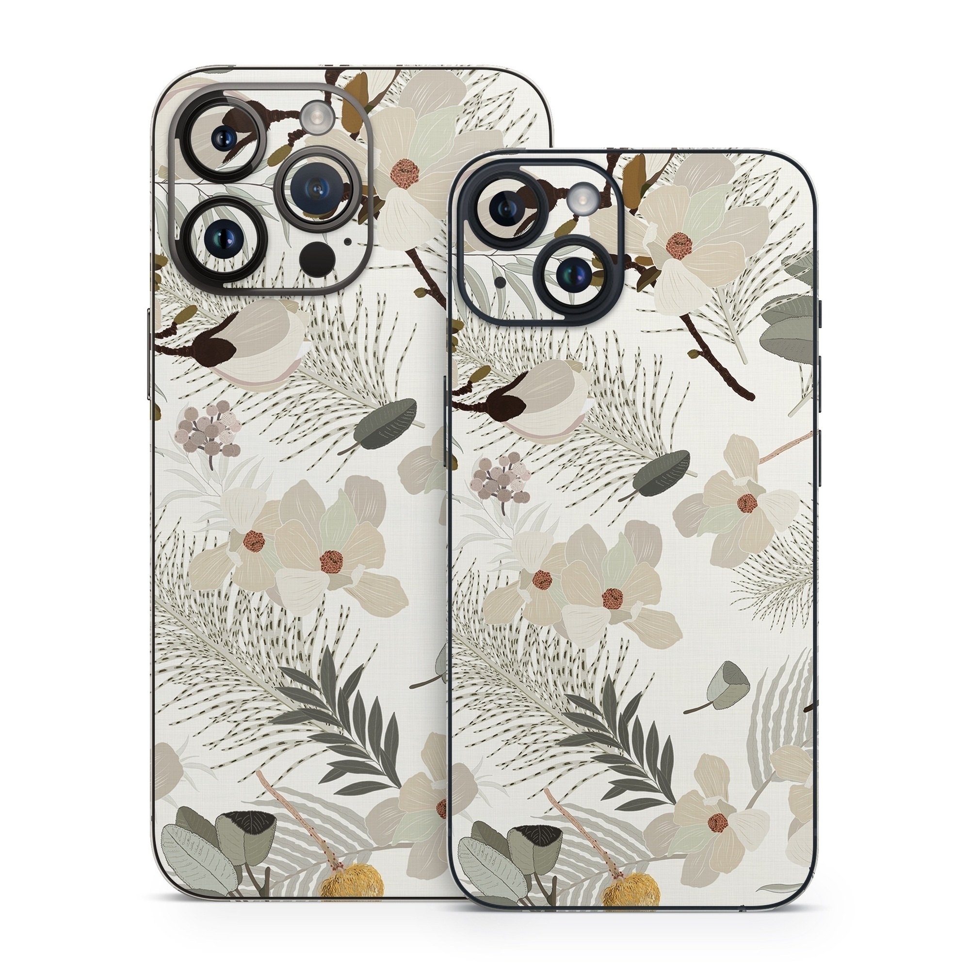 iStyles iPhone 14 Series Skin design of Branch, Botany, Twig, Plant, Textile, Organism, Art, Creative arts, Pattern, Tints and shades, with white, green, yellow, brown, gray colors, and tagged with patterns, flowers, nature, flowers, leaves.