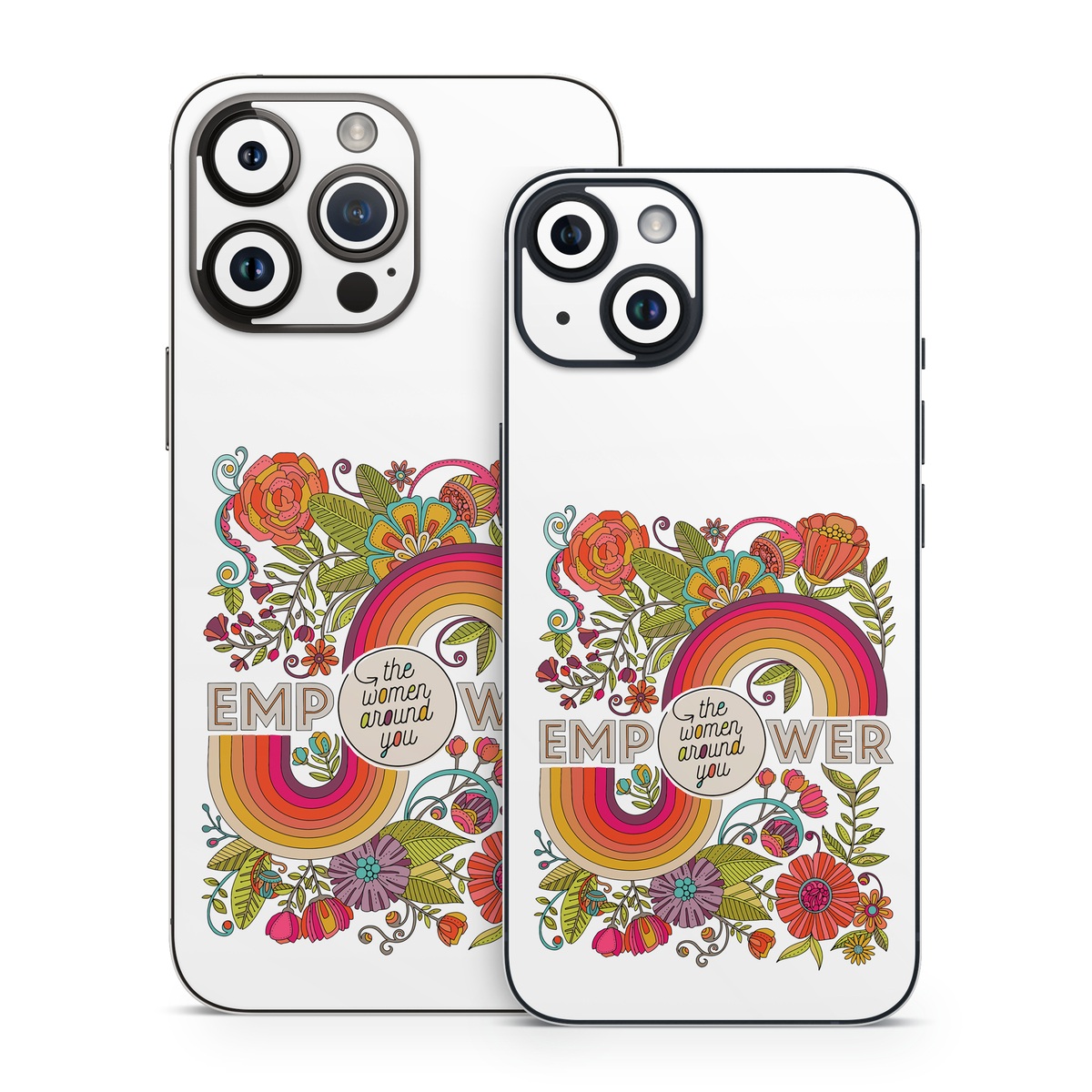 iStyles iPhone 14 Series Skin design of Botany, Flower, Font, Creative arts, Petal, Circle, Pattern, Art, Visual arts, Floral design, with white, red, yellow, orange, green, blue colors, and tagged with flowers, signs, flowers, rainbow, empower, women, around, you.