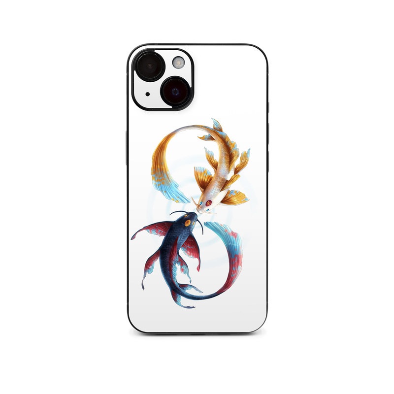 iStyles iPhone 14 Series Skin design of Marine invertebrates, Art, Wing, Feather, Tree, Beak, Electric blue, Fish, Natural material, Painting, with white, black, yellow, orange, red, blue colors, and tagged with animals, signs, blue, fish, koi, red, yellow.