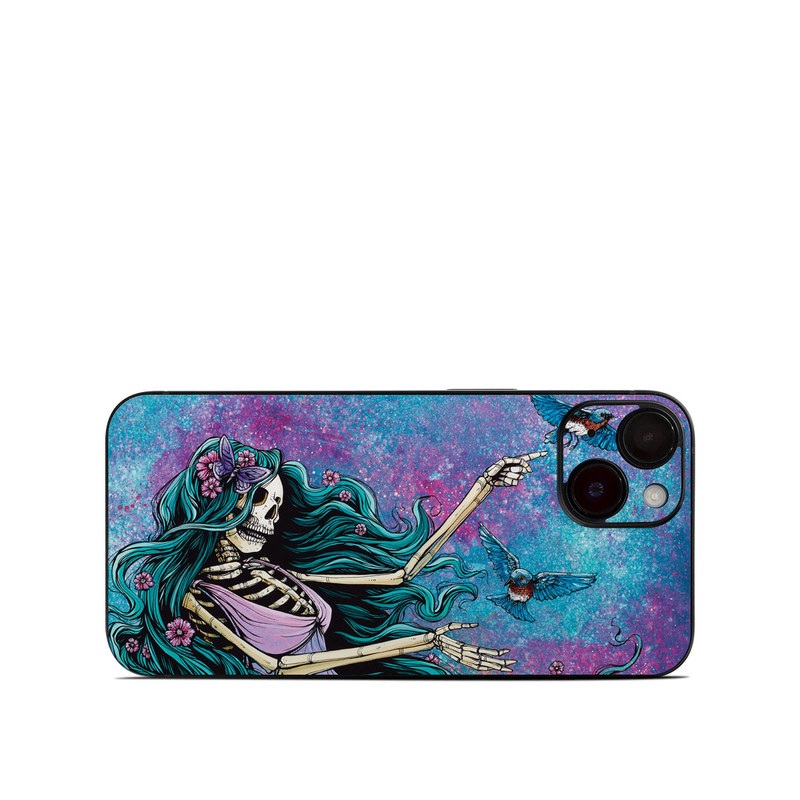 iStyles iPhone 14 Series Skin design of Green, Purple, Painting, Paint, Art, Cg artwork, Mythical creature, Musical instrument, Graffiti, Artist, with blue, purple, white, gray, brown colors, and tagged with skulls, flowers, animals, blue, hair, purple, dress, beautiful, woman, girl, bird.
