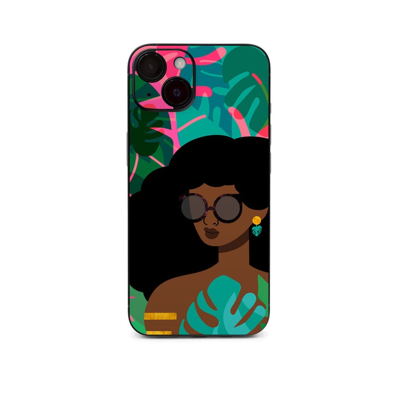 iStyles iPhone 14 Series Skin design of Illustration, Afro, Art, Eyewear, Glasses, Graphic design, Visual arts, Graphics, Fictional character, with brown, black, green, pink, blue, yellow colors, and tagged with people, nature, floral, flowers, nature, plants, woman.