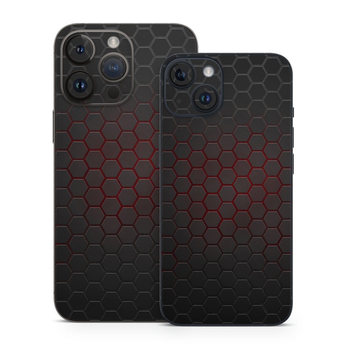 iStyles iPhone 14 Series Skin design of Black, Pattern, Metal, Design, Mesh, Carbon, Space, Wallpaper, with black, red colors, and tagged with lookslike, fantasy, space, drones, geometric, hexagon, tech.