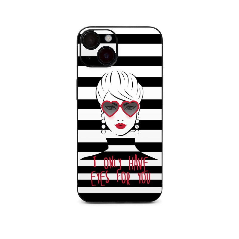 iStyles iPhone 14 Series Skin design of Rectangle, Font, Gesture, Eyewear, Art, Technology, Personal protective equipment, Goggles, Logo, Eyelash, with black, white, yellow, red colors, and tagged with signs, objects, people, patterns, blackandwhite, girl, glasses, red, stripes, only, have, eyes, for, you.