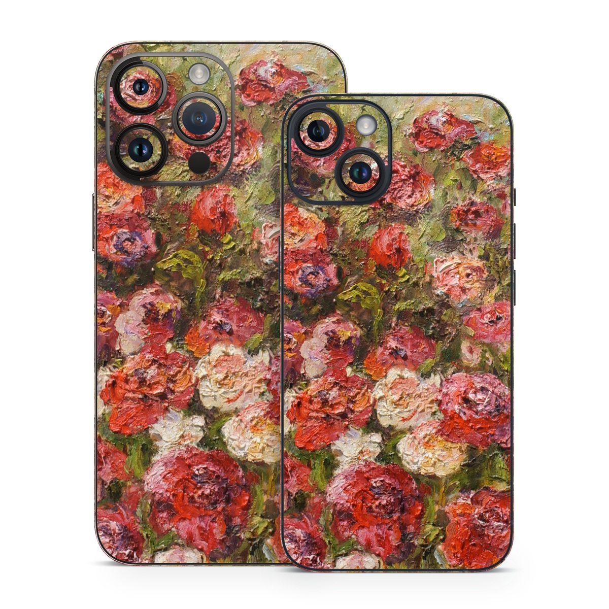 iStyles iPhone 14 Series Skin design of Flower, Garden roses, Rose, Plant, Floribunda, Flowering plant, Rosa × centifolia, Rose family, Botany, Petal, with red, black, green, gray colors, and tagged with flowers, fineart.