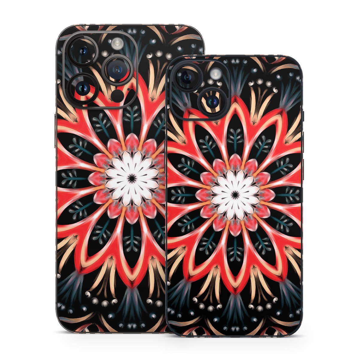 iStyles iPhone 14 Series Skin design of Pattern, Psychedelic art, Symmetry, Design, Art, Visual arts, Textile, Kaleidoscope, Fractal art, Ornament, with black, red, white, blue, yellow, orange colors, and tagged with patterns, flowers, abstract, abstract, blue, bright, floral, flower, orange, white.