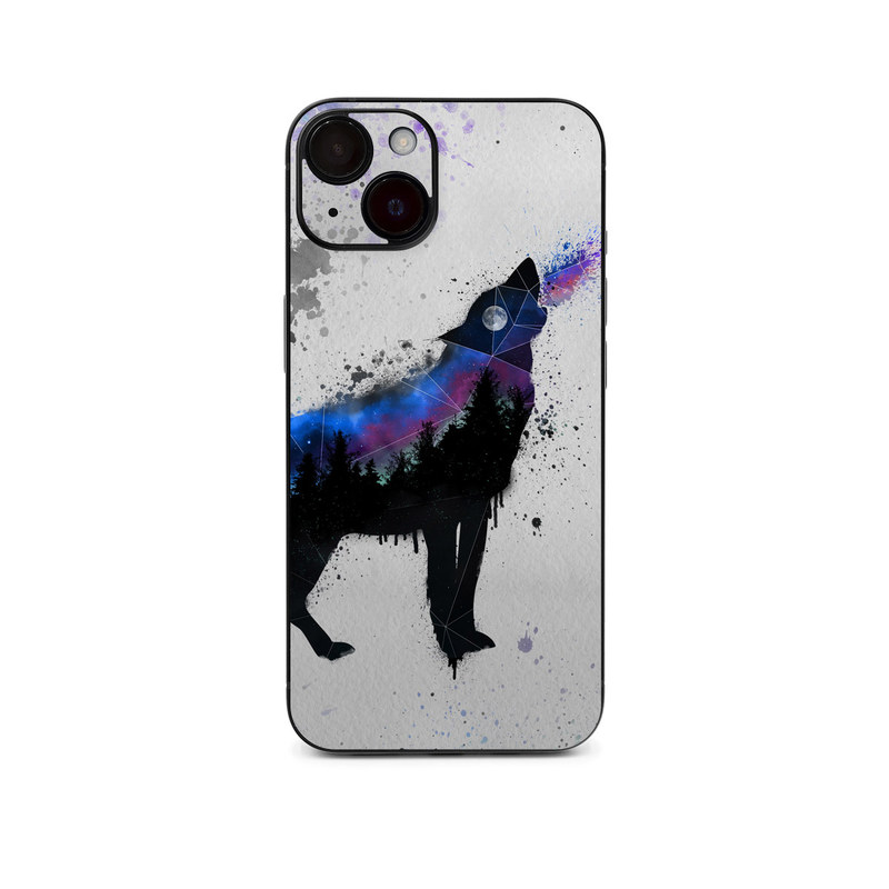 iStyles iPhone 14 Series Skin design of Canidae, Art, Illustration, Watercolor paint, Dog, Graphic design, Street art, Acrylic paint, Painting, Visual arts, with gray, white, blue, black, green, purple colors, and tagged with animals, nature, space, animals, coyote, dog, moon, nature, night, stars, watercolor, wolf.
