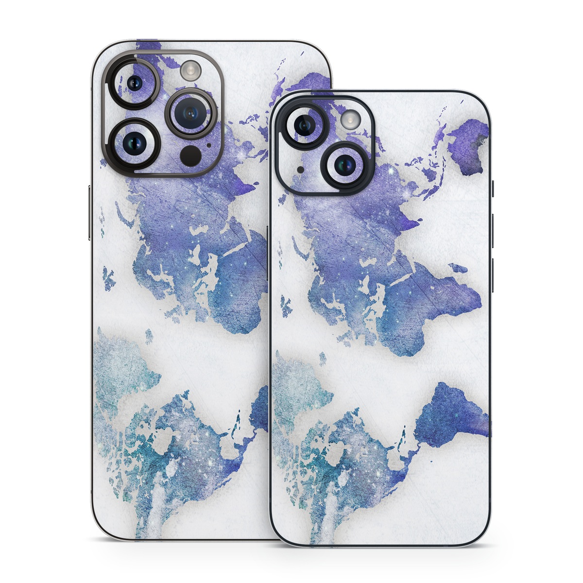 iStyles iPhone 14 Series Skin design of World, Map, Watercolor paint, Illustration, with white, blue, purple colors, and tagged with maps, globe, map, pastel, travel, watercolor, world.