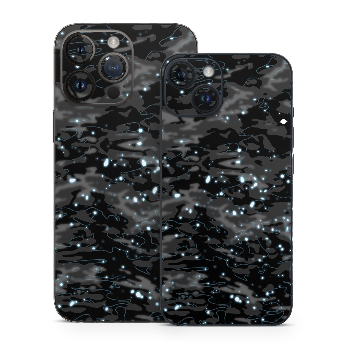 iStyles iPhone 14 Series Skin design of Black, Water, Space, Black-and-white, Granite, with blue, white, gray, blue colors, and tagged with space, patterns, black, blue, camo, galaxy, space, stars, universe.