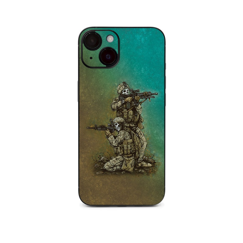 iStyles iPhone 14 Series Skin design of Art, Sculpture, Landscape, Illustration, Visual arts, Wood, Drawing, Fictional character, Soil, Circle, with blue, green, white, gray, brown colors, and tagged with skulls, military, objects, military, guns, buddy.