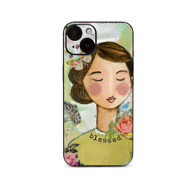 iStyles iPhone 14 Series Skin design of Illustration, Cheek, Art, Watercolor paint, Retro style, Painting, Plant, Flower, Fashion illustration, Fictional character, with pink, green, yellow, white, red, blue colors, and tagged with signs, flowers, animals, music, people, blessed, butterflies, flowers, inspire, uplifting.