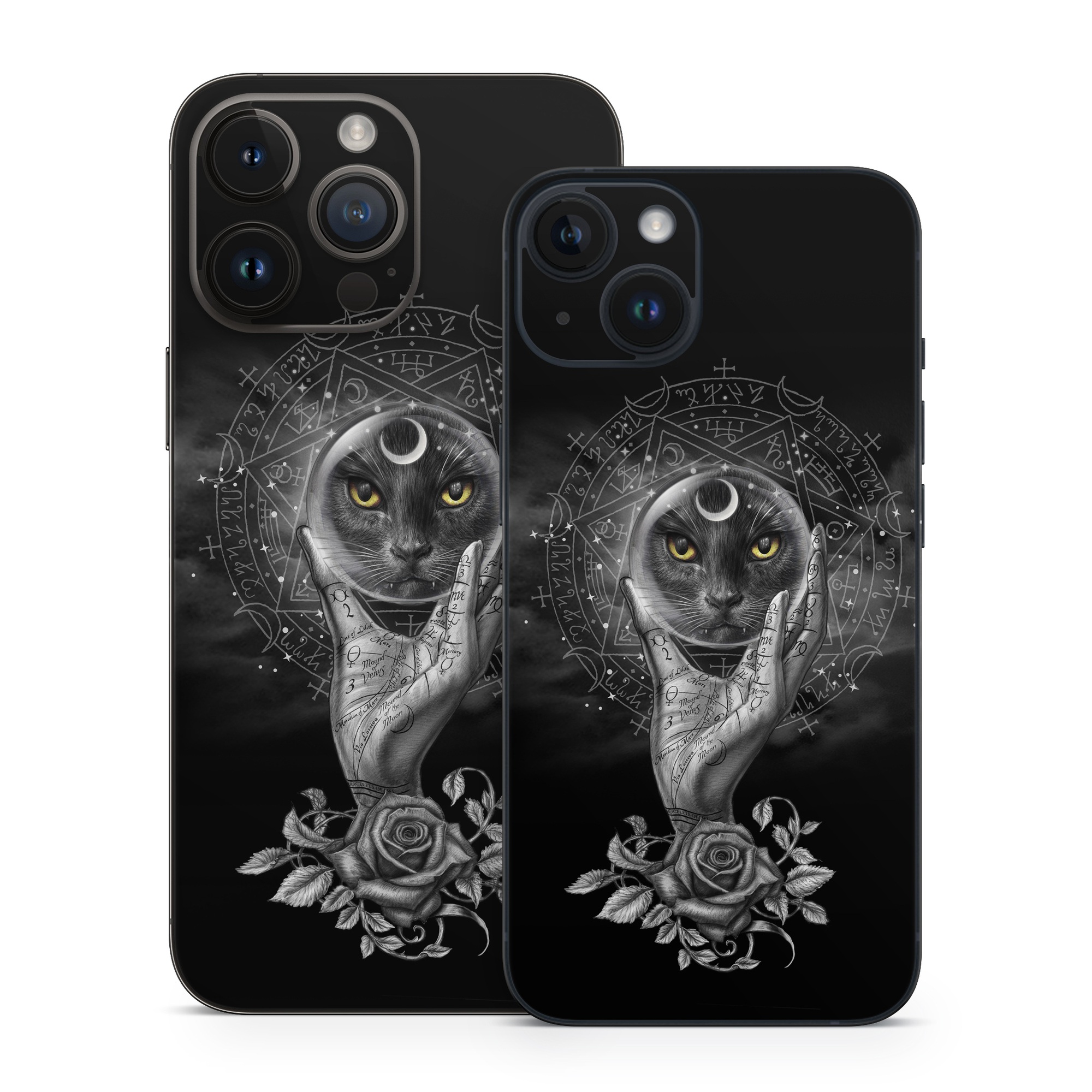 iStyles iPhone 14 Series Skin design of Head, Eye, Flash photography, Painting, Headgear, Art, Font, Snout, Darkness, Owl, with black, white, gray colors, and tagged with animals, signs, flowers, people, objects, fantasy, cat, crystal, ball, roses.