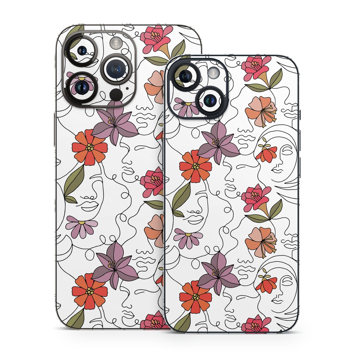 iStyles iPhone 14 Series Skin design of Flower, Plant, White, Product, Petal, Branch, Rectangle, Botany, Textile, Creative arts, with white, red, purple, green, orange colors, and tagged with patterns, flowers, people, drawing, flowers, outline, pattern, women.