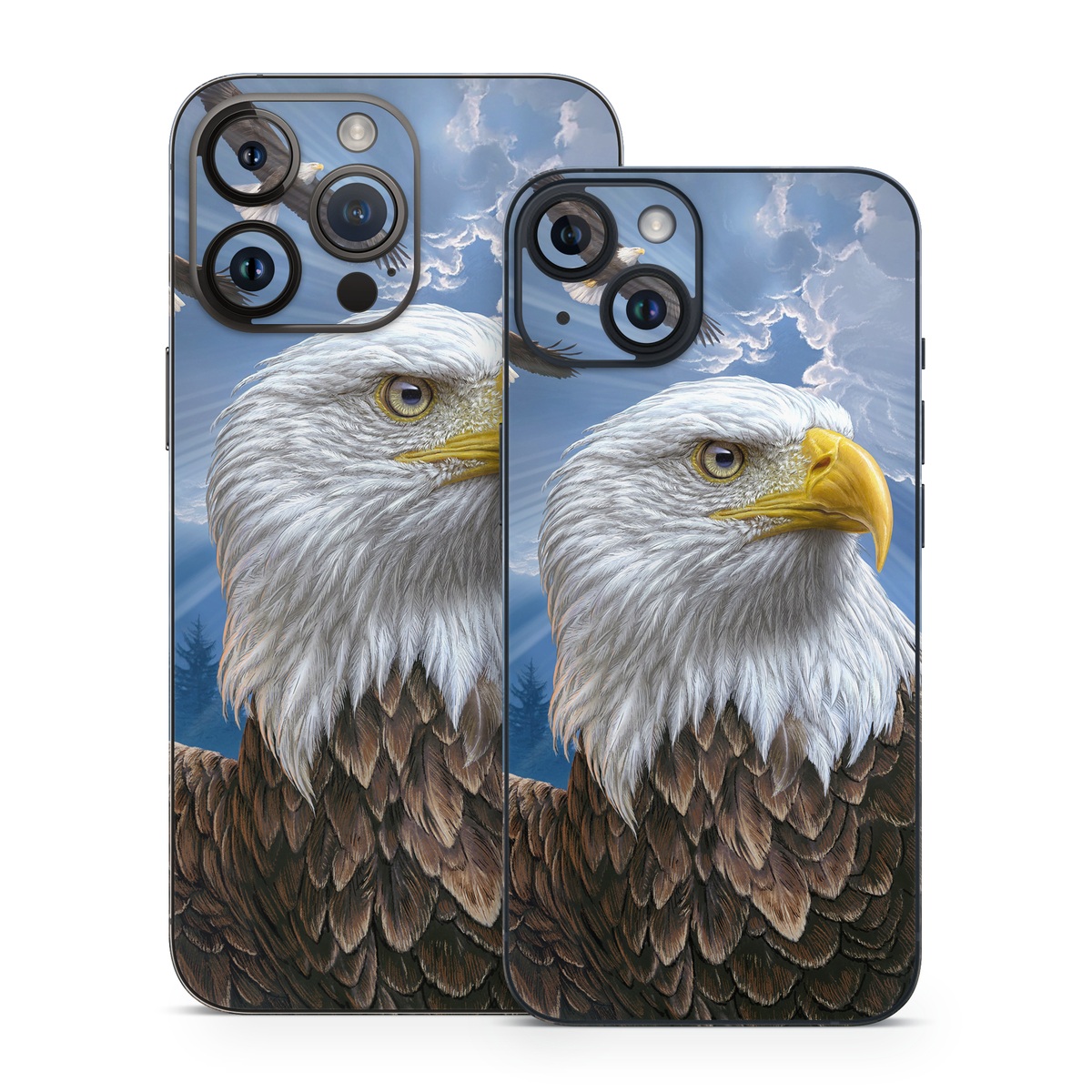 iStyles iPhone 14 Series Skin design of Bird, Bald eagle, Bird of prey, Vertebrate, Accipitriformes, Accipitridae, Eagle, Nature, Beak, Kite, with blue, brown, white, yellow colors, and tagged with animals, nature, america, animals, birds, eagle, nature.