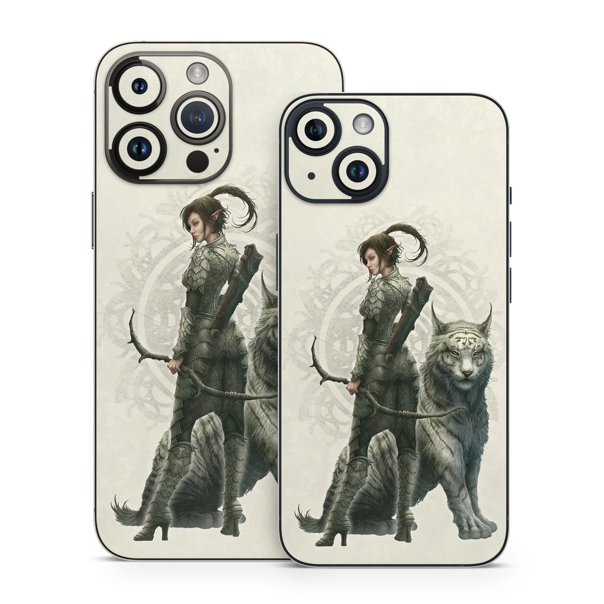 iStyles iPhone 14 Series Skin design of Illustration, Fictional character, Drawing, Woman warrior, Art, Mythology, Sketch, with gray, black, pink, yellow, green colors, and tagged with fantasy, animals, objects, people.