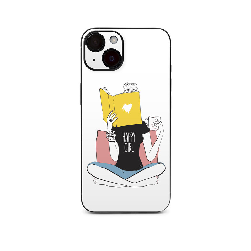 iStyles iPhone 14 Series Skin design of White, Sleeve, Gesture, Cartoon, Comfort, Elbow, Font, Graphics, Knee, Art, with white, black, blue, pink, yellow colors, and tagged with objects, people, signs, hearts, reading, happy, cup, coffee, girl.