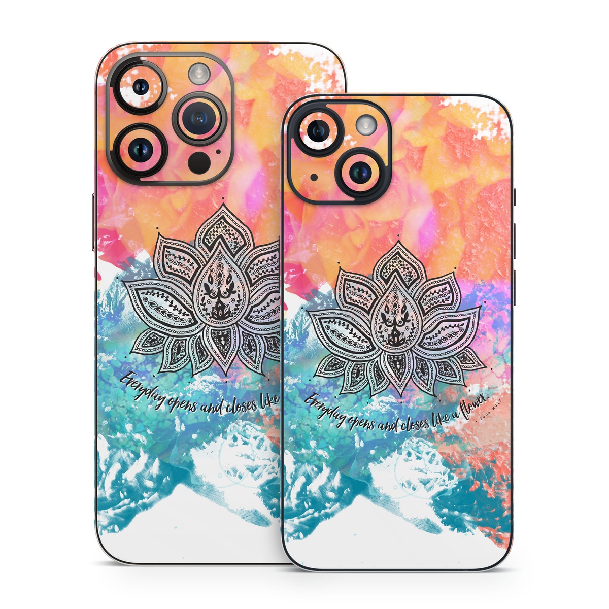iStyles iPhone 14 Series Skin design of Pink, Leaf, Pattern, Design, Graphic design, Illustration, Symmetry, Visual arts, Art, Plant, with orange, yellow, red, blue, green, black colors, and tagged with signs, flowers, colorful, flower, lotus.
