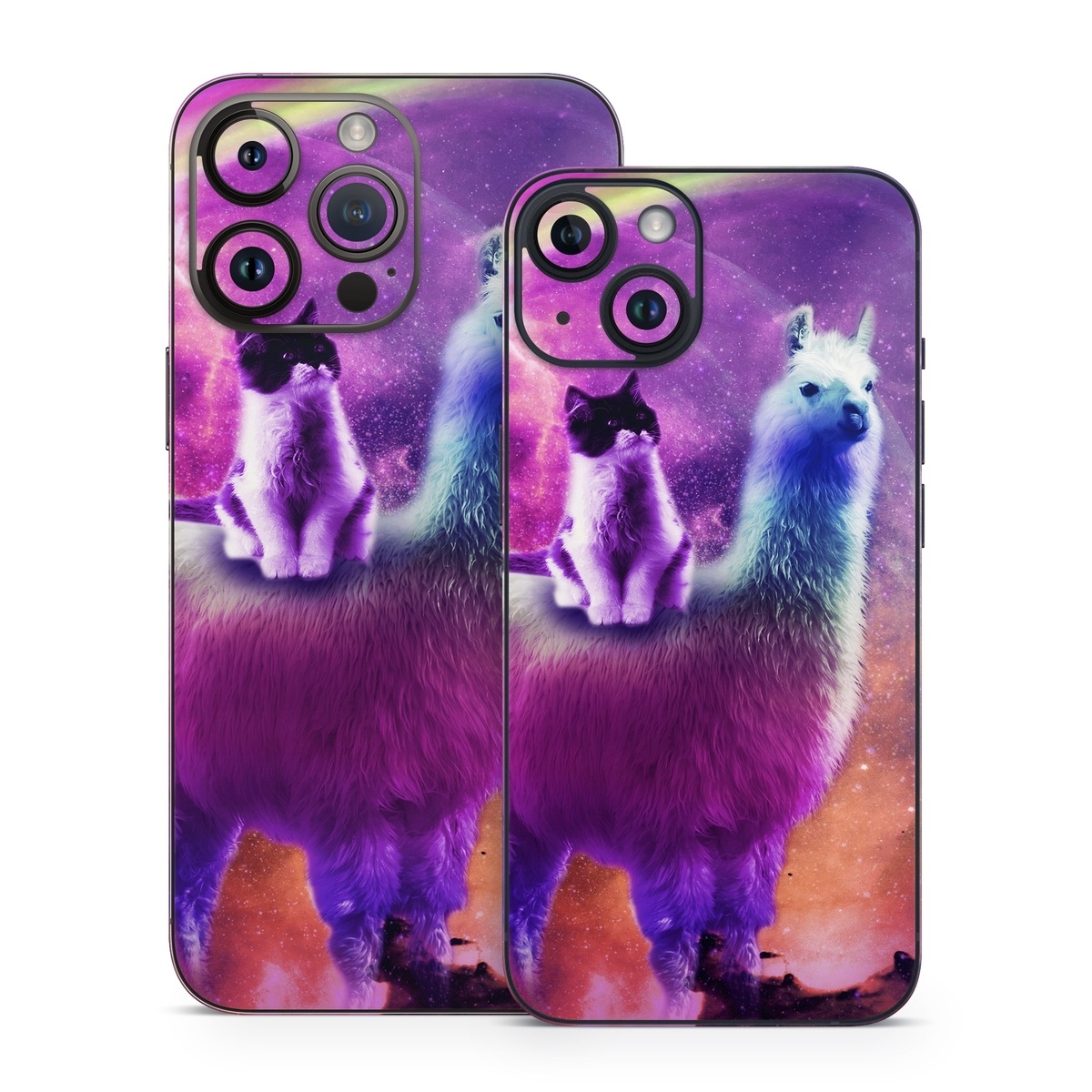 iStyles iPhone 14 Series Skin design of Llama, Purple, Camelid, Alpaca, Sky, Livestock, Space, with purple, white, blue, pink, yellow, black colors, and tagged with space, animals, fantasy, animals, funny, galaxy, lasers, random, space, weird.