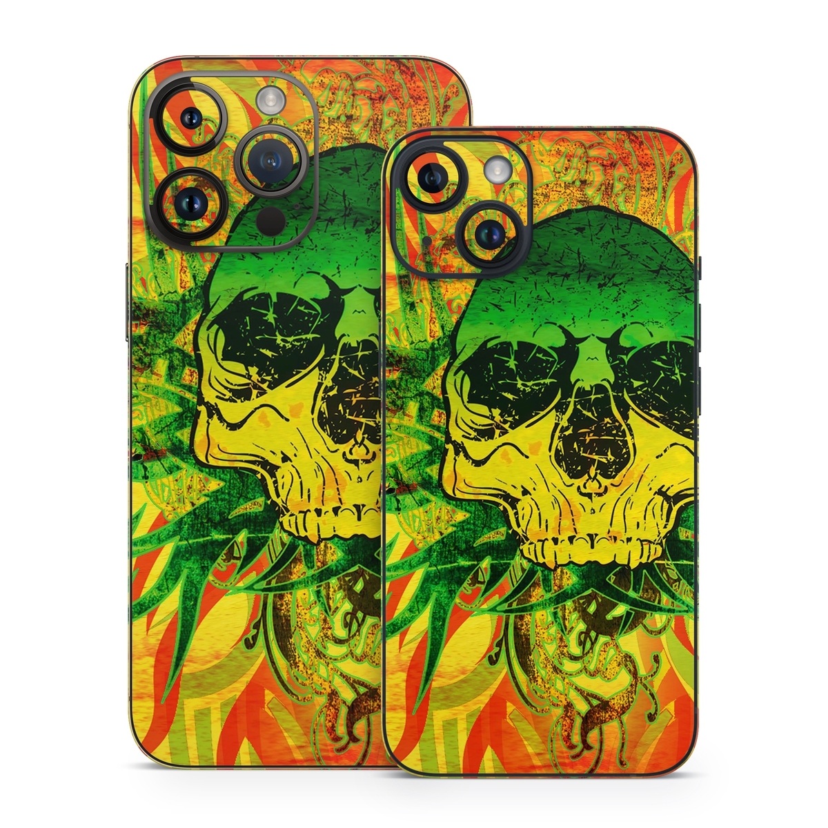 iStyles iPhone 14 Series Skin design of Psychedelic art, Skull, Illustration, Bone, Art, Graphic design, Visual arts, Poster, Plant, Painting, with green, orange, black, red colors, and tagged with skulls.