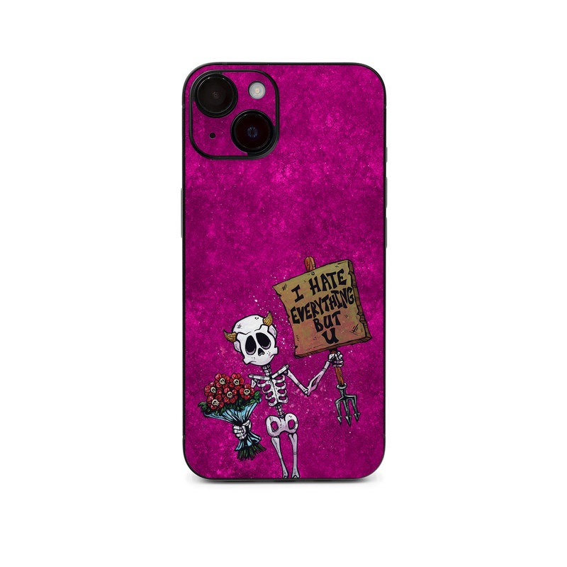 iStyles iPhone 14 Series Skin design of Purple, Pink, Violet, Magenta, Font, Tints and shades, Art, Electric blue, Skull, Rectangle, with white, gray, pink, red, green, brown, black colors, and tagged with skulls, flowers, objects, signs, flowers, love, message.