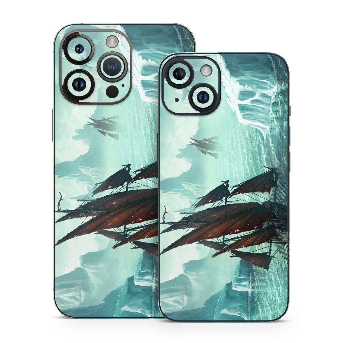 iStyles iPhone 14 Series Skin design of Cg artwork, Vehicle, Ghost ship, Manila galleon, Fluyt, Adventure game, First-rate, Sailing ship, Mythology, Strategy video game, with gray, black, blue, green, white colors, and tagged with fantasy, objects, nature.