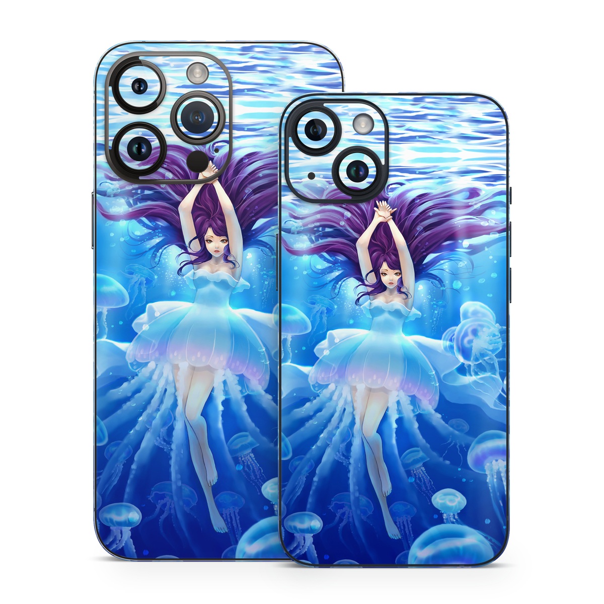 iStyles iPhone 14 Series Skin design of Jellyfish, Cnidaria, Organism, Marine biology, Marine invertebrates, Water, Bioluminescence, Illustration, Electric blue, Fictional character, with blue, purple, gray colors, and tagged with fantasy, people, aquatic, blue, jellyfish, ocean, sea, sealife.