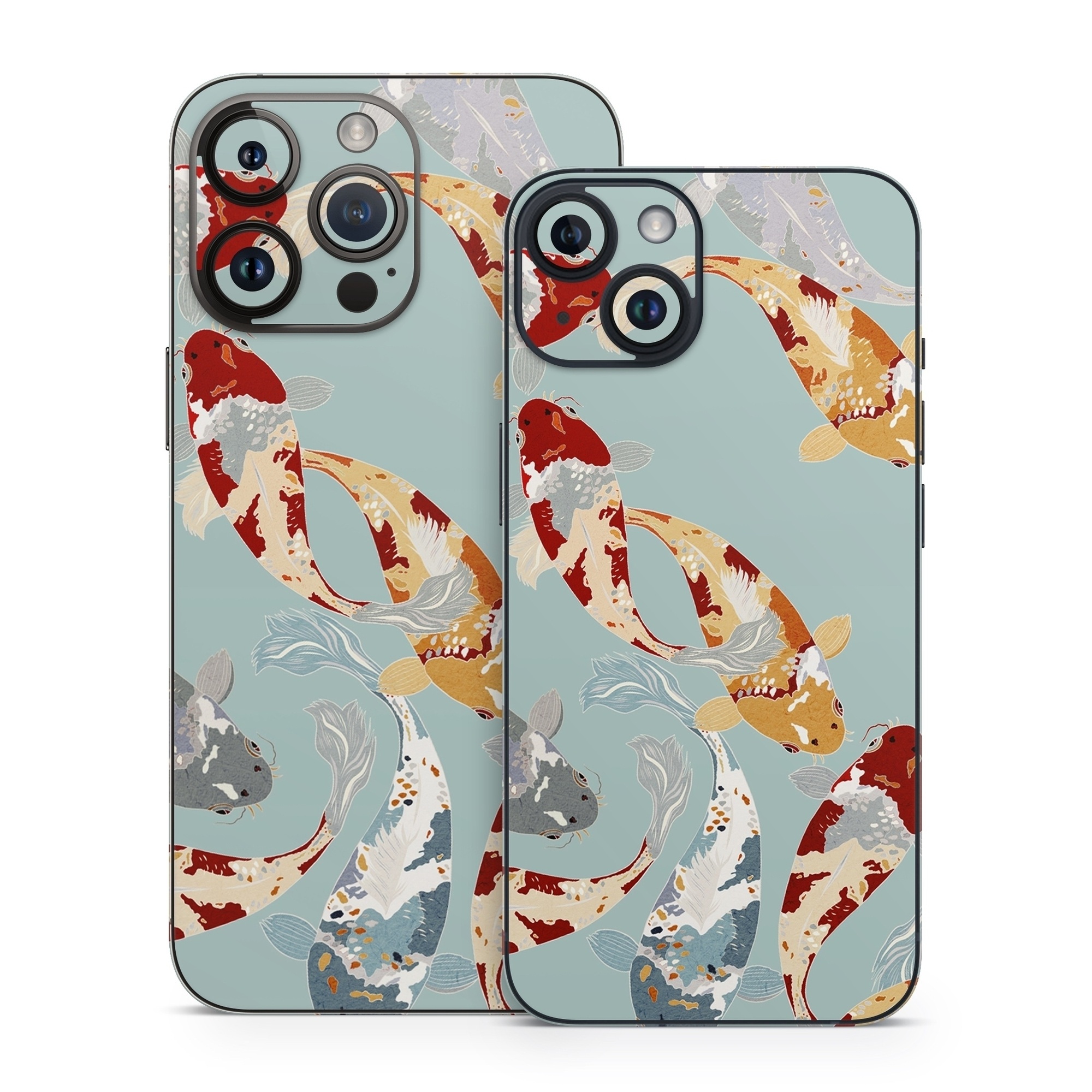 iStyles iPhone 14 Series Skin design of Ecoregion, World, Organism, Line, Font, Art, Pattern, Electric blue, Graphics, Illustration, with blue, white, red, orange, yellow, gray colors, and tagged with patterns, animals, koi, carp, ornamental, good, luck.