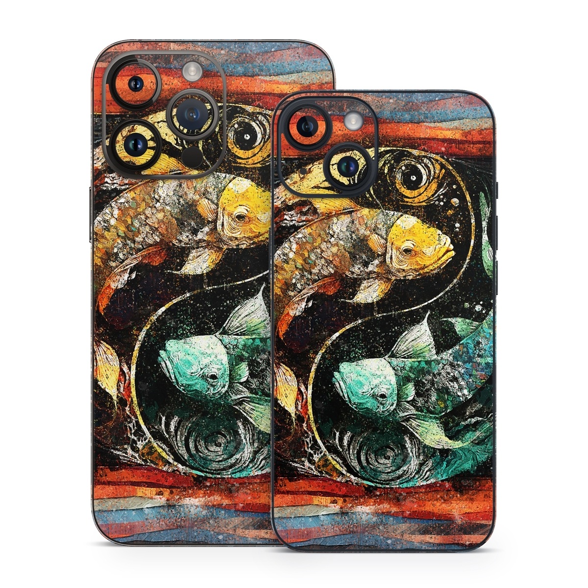 iStyles iPhone 14 Series Skin design of Art paint, Paint, Painting, Art, Creative arts, Pattern, Visual arts, Mural, Illustration, Graphics, with black, red, blue, yellow, green, orange, purple colors, and tagged with animals, signs, asian, koi, yin, yang.