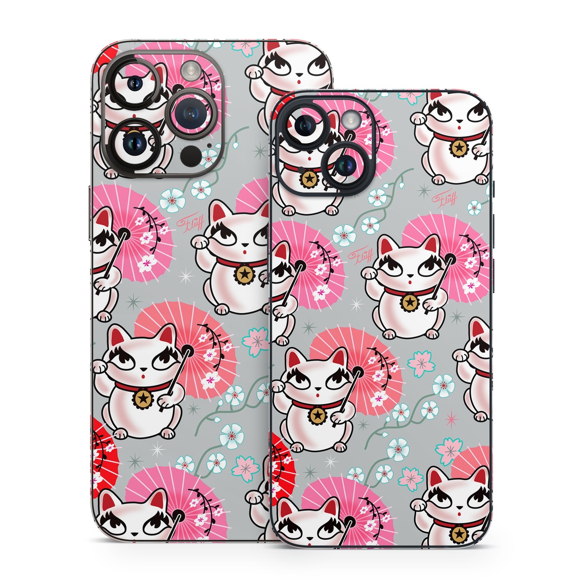 iStyles iPhone 14 Series Skin design of Pink, Red, Cartoon, Design, Line, Textile, Pattern, Illustration, Smile, Fictional character, with white, red, pink, gray, blue, black colors, and tagged with patterns, animals, objects, cat, cats, fantasy, flower, flowers, grey, pink.