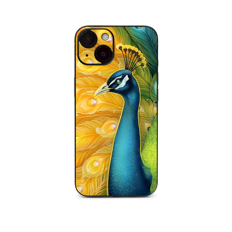 iStyles iPhone 14 Series Skin design of Bird, Peafowl, Phasianidae, Beak, Organism, Art paint, Galliformes, Art, Feather, Painting, with yellow, orange, green, blue, white, black colors, and tagged with fantasy, animals, patterns, peacock, peahen, peafowl, feathers.