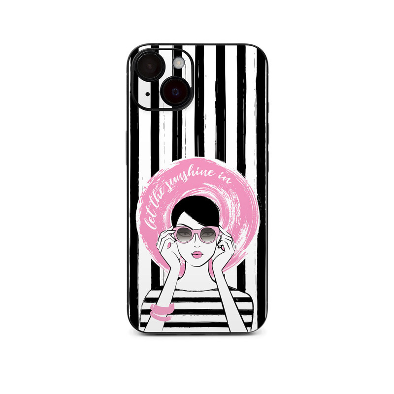 iStyles iPhone 14 Series Skin design of Organ, Vision care, Purple, Pink, Violet, Font, Eyewear, Magenta, Line, Art, with black, white, pink, gray colors, and tagged with signs, objects, people, patterns, blackandwhite, girl, glasses, hat, pink, stripes.