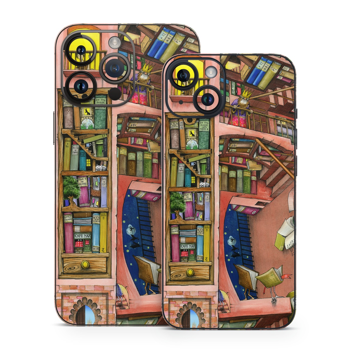 iStyles iPhone 14 Series Skin design of Cartoon, Building, Art, Architecture, Design, Fun, Retail, Illustration, Neighbourhood, Room, with pink, yellow, blue, red, orange, brown colors, and tagged with patterns, urban, objects, animals, book, books, fantasy, illustration, library, reading.