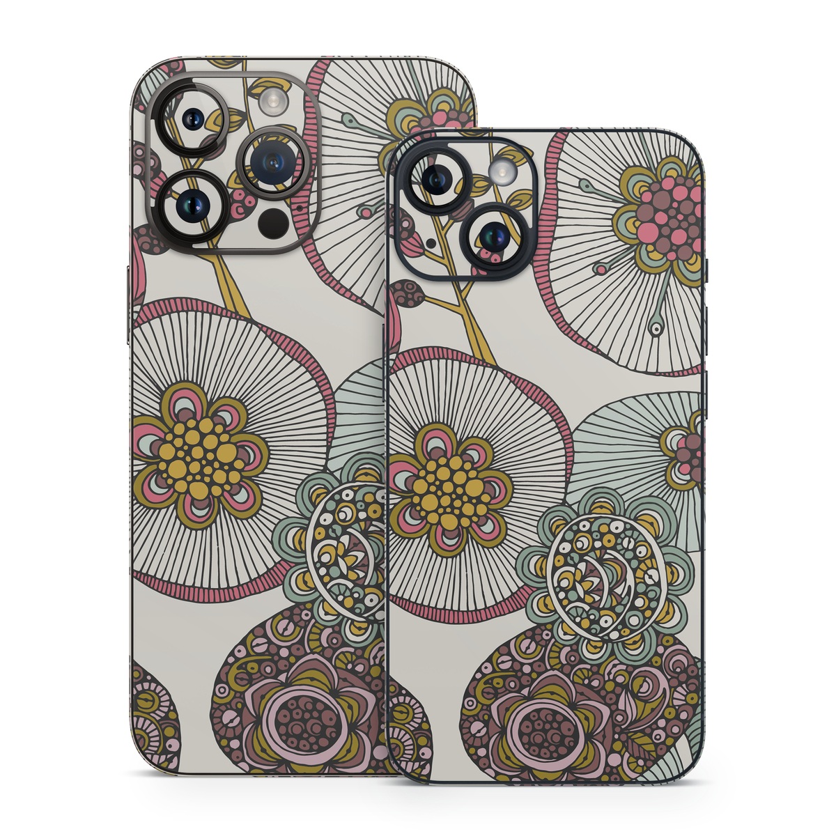 iStyles iPhone 14 Series Skin design of Pattern, Textile, Botany, Visual arts, Motif, Design, Needlework, Circle, Floral design, with gray, pink, green, blue, purple colors, and tagged with flowers, patterns, flowers, lotus, monochromatic, mute, pattern.