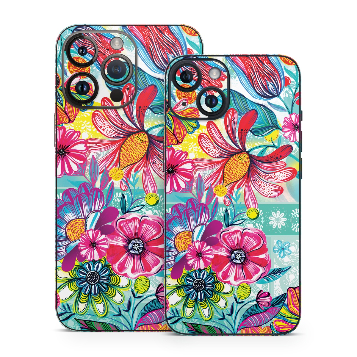 iStyles iPhone 14 Series Skin design of Pattern, Floral design, Textile, Pink, Design, Flower, Visual arts, Wildflower, Plant, with blue, pink, purple, red, green, yellow, orange colors, and tagged with patterns, flowers, bright, carpintos, colorful, flowers, spring, summer, teal.