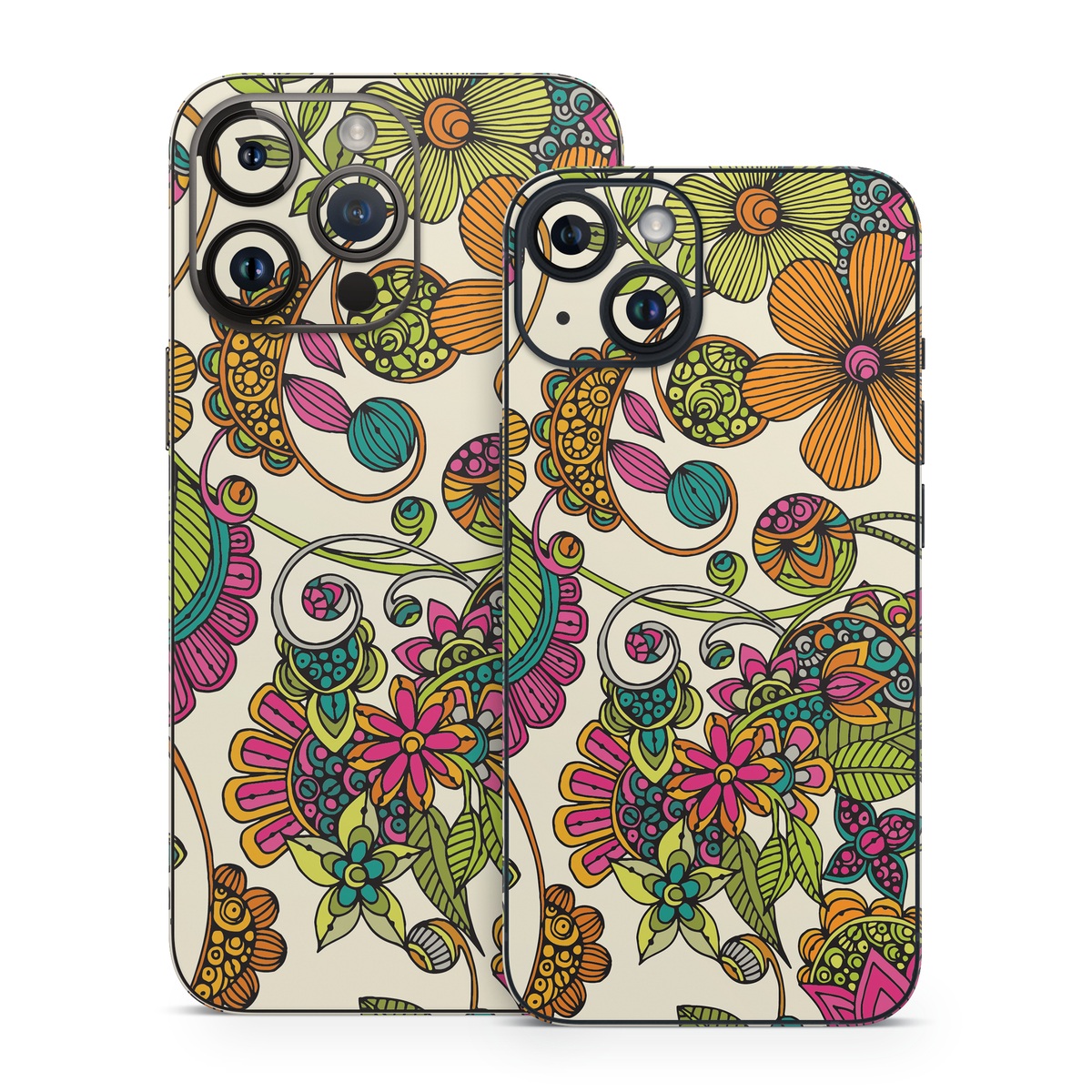 iStyles iPhone 14 Series Skin design of Pattern, Floral design, Motif, Design, Visual arts, Botany, Pedicel, Flower, Plant, Textile, with green, pink, orange, blue colors, and tagged with flowers, patterns, bright, colorful, flowers, pattern.