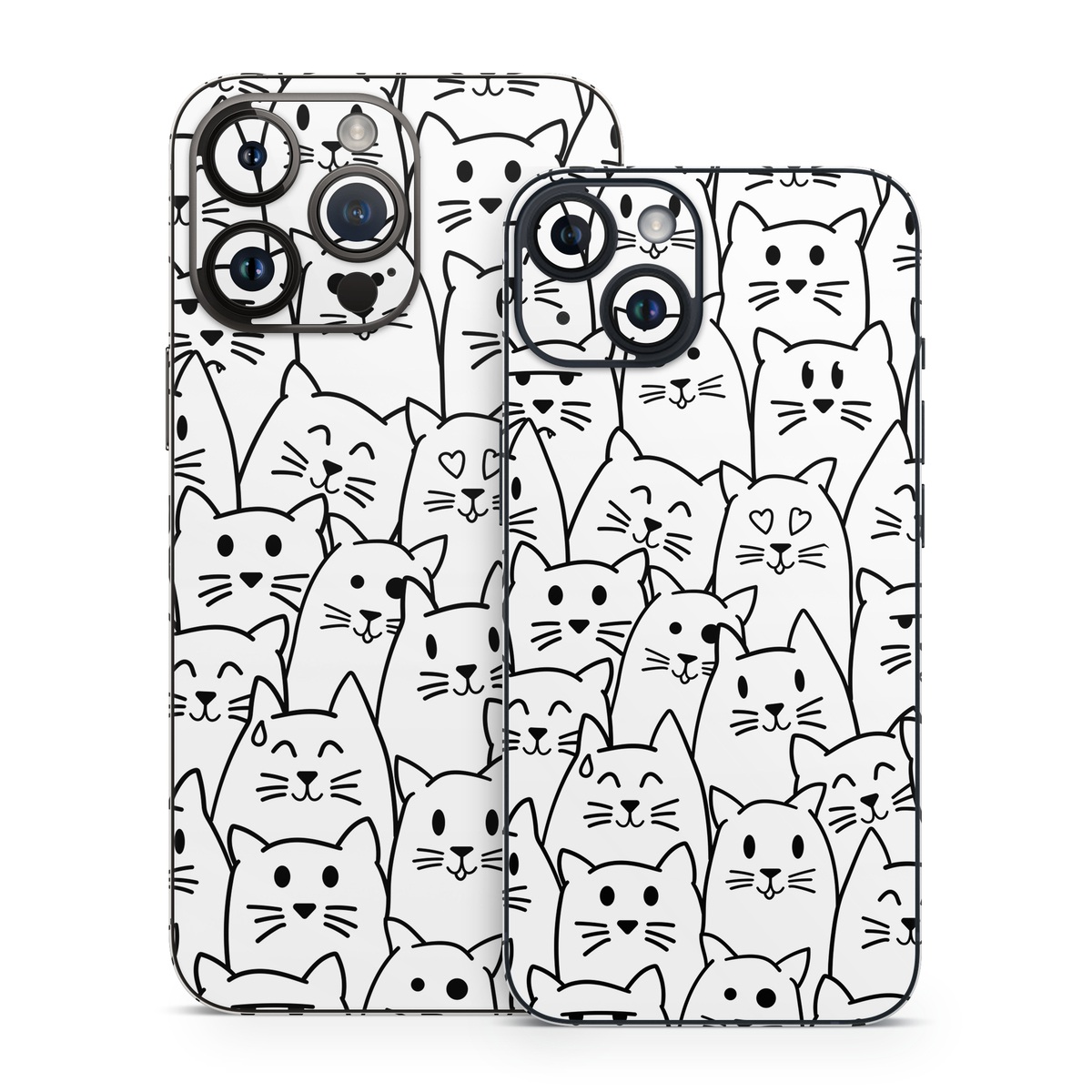iStyles iPhone 14 Series Skin design of White, Line art, Text, Black, Pattern, Black-and-white, Line, Design, Font, Organism, with white, black colors, and tagged with patterns, animals, animals, cartoon, cats, cute, kitty, lineart, sketch.