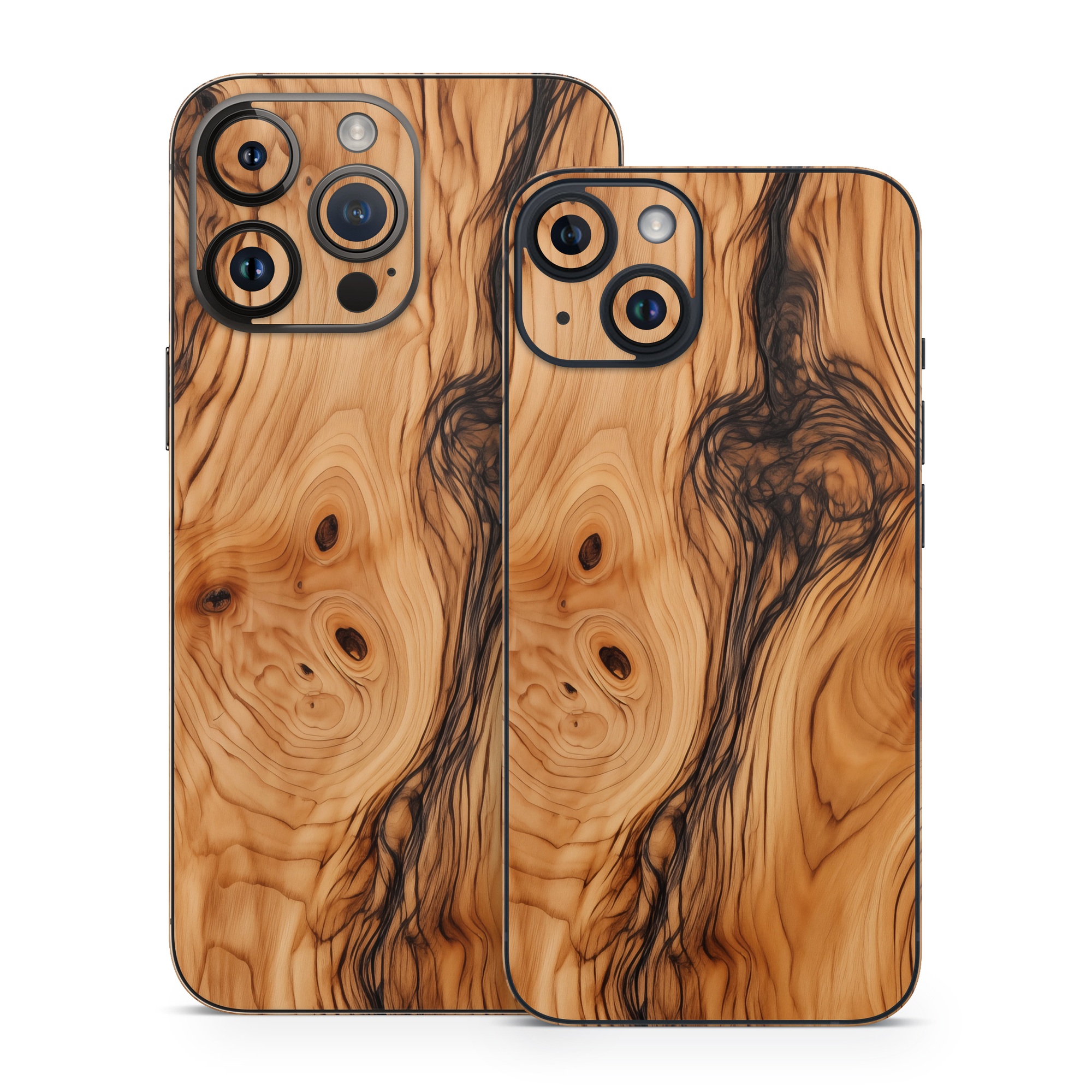 iStyles iPhone 14 Series Skin design of Brown, Wood, Trunk, Wood stain, Floor, Liquid, Art, Woody plant, Landscape, Flooring, with black, brown, orange colors, and tagged with lookslike, patterns, wood, olea, europaea.