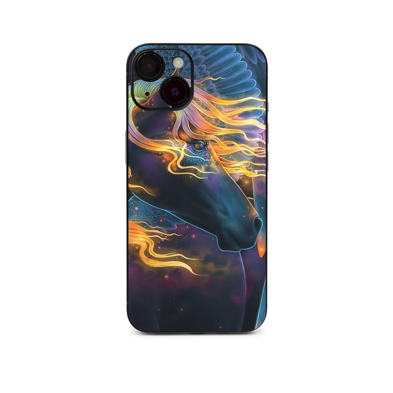 iStyles iPhone 14 Series Skin design of Organism, Astronomical object, Art, Electric blue, Space, Darkness, Liquid, Science, Graphics, Visual arts, with black, blue, yellow, white, orange, purple, red colors, and tagged with fantasy, animals, space, flames, horse, stars, constellations, sun.