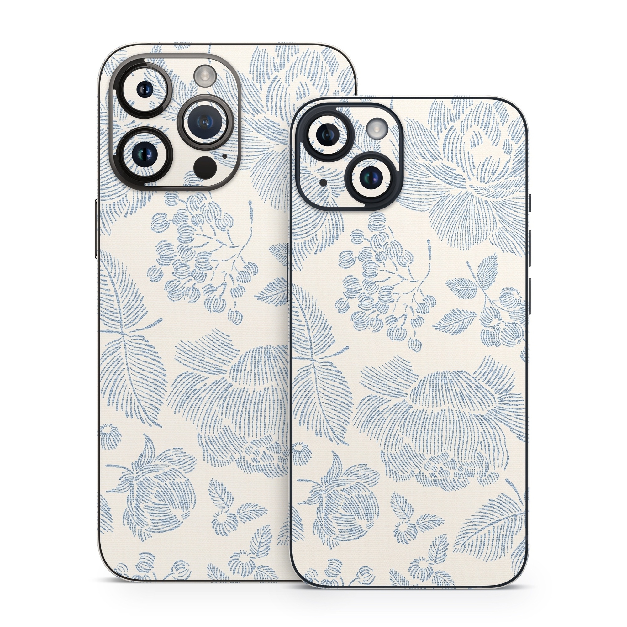 iStyles iPhone 14 Series Skin design of White, Botany, Leaf, Textile, Branch, Organism, Art, Aqua, Line, Rectangle, with white, blue colors, and tagged with patterns, flowers, nature, flowers, fabric.
