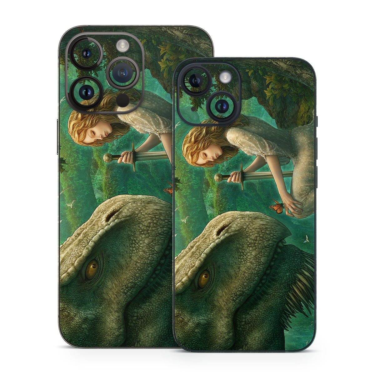 iStyles iPhone 14 Series Skin design of Dinosaur, Cg artwork, Mythology, Fictional character, Troodon, Extinction, Velociraptor, Illustration, Animated cartoon, Tyrannosaurus, with black, green, gray, red colors, and tagged with animals, people, nature, fantasy, objects.