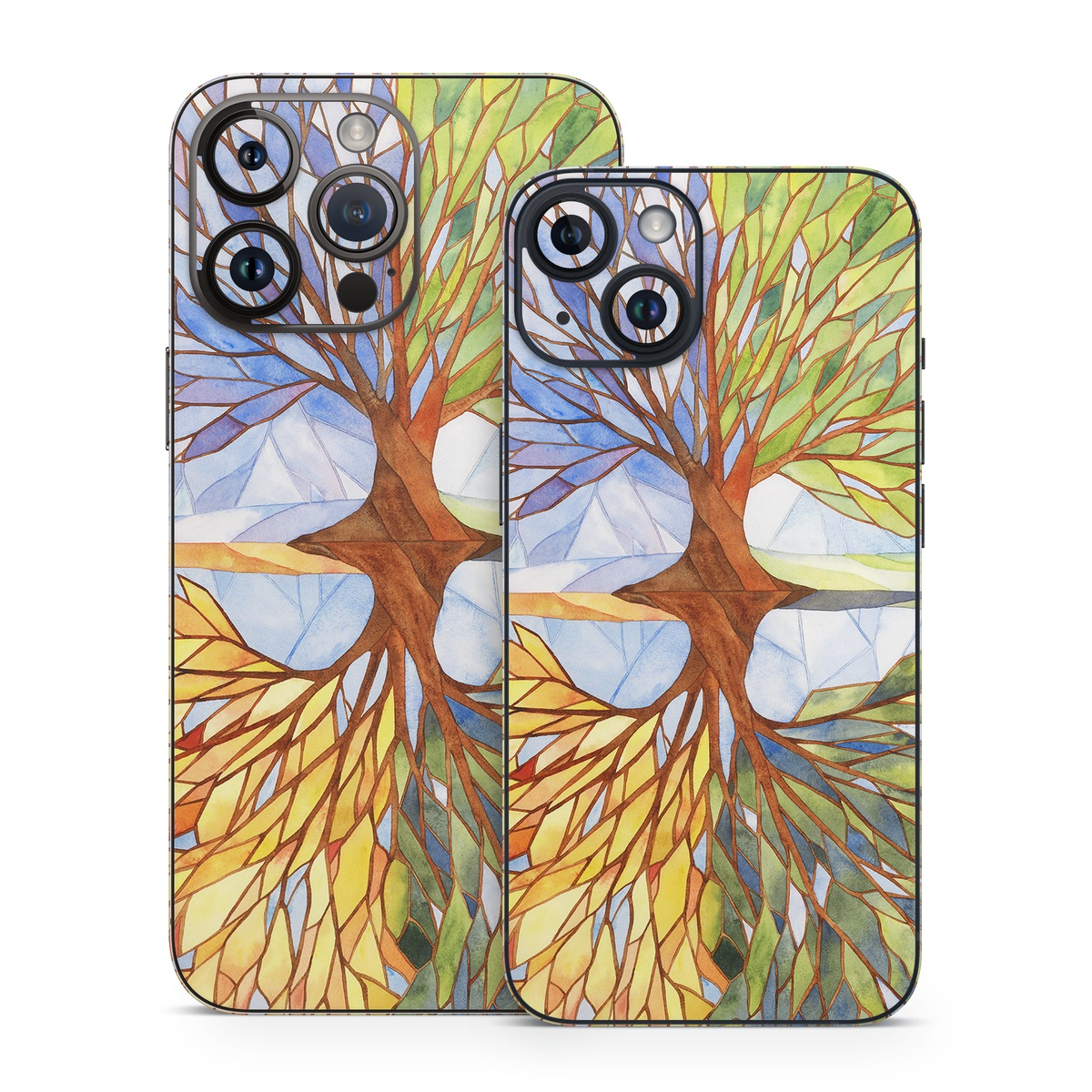 iStyles iPhone 14 Series Skin design of Leaf, Tree, Botany, Plant, Symmetry, Art, Pattern, Painting, Plant stem, Plane, with blue, brown, orange, yellow, red, purple colors, and tagged with nature, patterns, leaves, nature, plant, seasons, tree, watercolor.