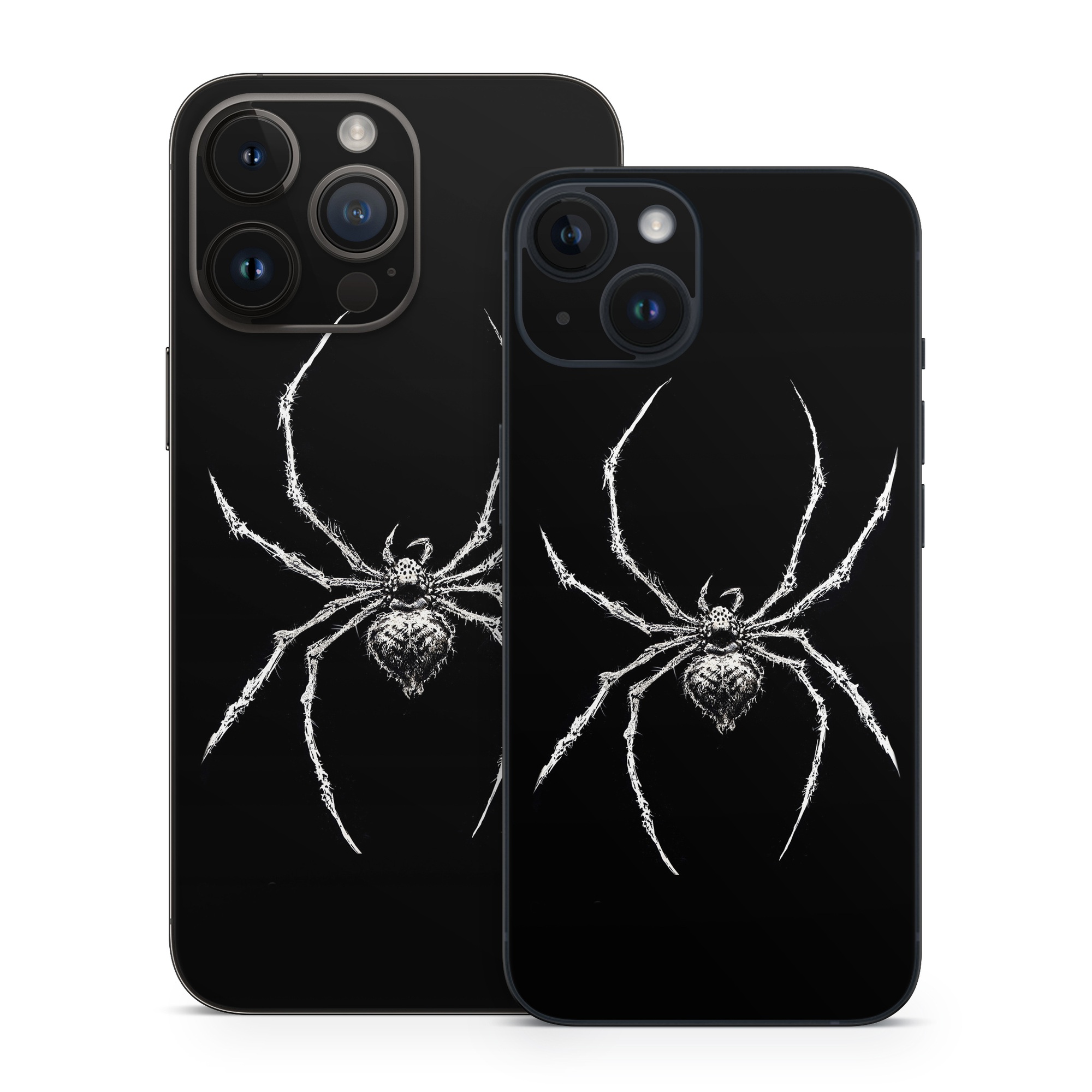 iStyles iPhone 14 Series Skin design of Arthropod, Spider, Insect, Spider web, Terrestrial animal, Arachnid, Invertebrate, Tangle-web spider, Symmetry, Terrestrial plant, with black, white, gray colors, and tagged with animals, fantasy, spider, arachnids, arachnophobia.