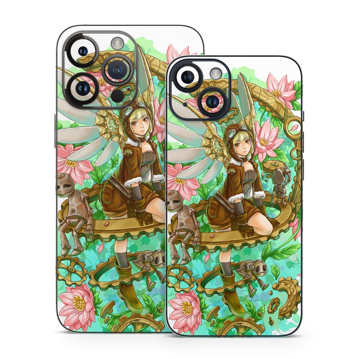 iStyles iPhone 14 Series Skin design of Illustration, Fictional character, Clip art, Art, Graphics, Plant, with white, yellow, pink, green, brown, black colors, and tagged with people, fineart, fantasy, flowers, objects, angel, flowers, gear, gears, girl, pinup, pinupgirl, punk, steampunk, tinker.